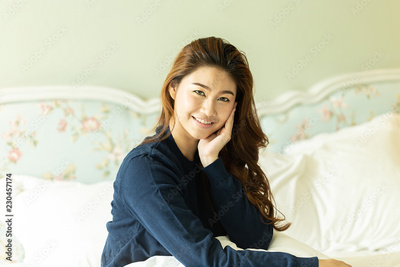 Beautiful Attractive Asian woman wearing blue sweater sitting on bed and smile with healthy skin feeling so fresh and happiness