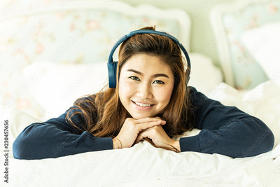 Beautiful Attractive Asian young woman listen music and lying on bed in bedroom feeling so relax and comfortable