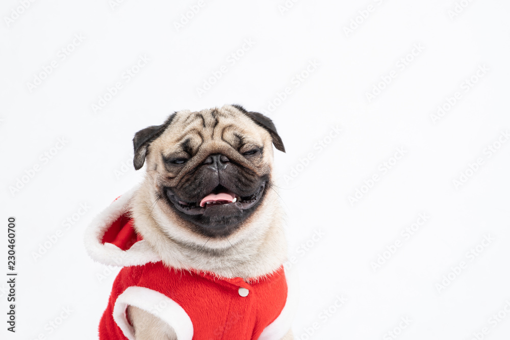Cute Dog Pug Breed in Red Santa coat Costume smile and happiness in Christmas and new year day isolated on white background,Healthy Purebred dog with Christmas concept
