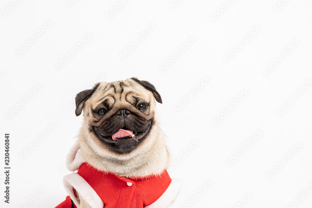Cute Dog Pug Breed in Red Santa coat Costume smile and happiness in Christmas and new year day isolated on white background,Healthy Purebred dog with Christmas concept