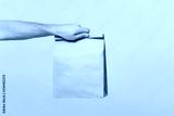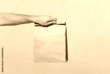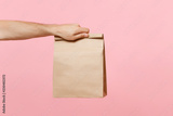 Close up male holding in hand brown clear empty blank craft paper bag for takeaway isolated on pastel pink background. Packaging template mock up. Delivery service concept. Copy space advertising area