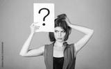 Thinking woman. Concept - challenging issue, looking for the answer. Isolated girl. Woman with doubtful expression and question marks. Question mark, symbol. Girl question. Getting answers, thinking.