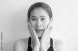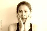 Portrait of Asian woman touching her cheeks after applying beauty cream and looking to the camera.