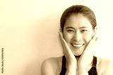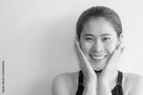 Portrait of Asian woman touching her cheeks after applying beauty cream and looking to the camera.