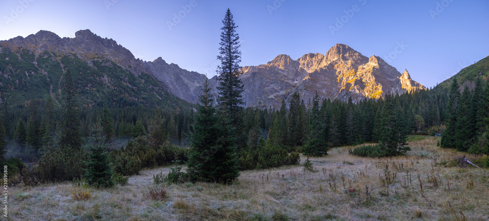 Mountain glade in a frosty morning In Tatras, Morskie Oko, Poland