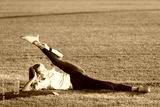 Fitness blonde long haired woman in sportswear laying on the grass, listening music and stretching at the football stadium outdoor, healthy lifestyle and people concept