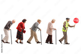 Senior people walking in a line behind an elderly man with a safety vest and stop sign
