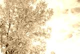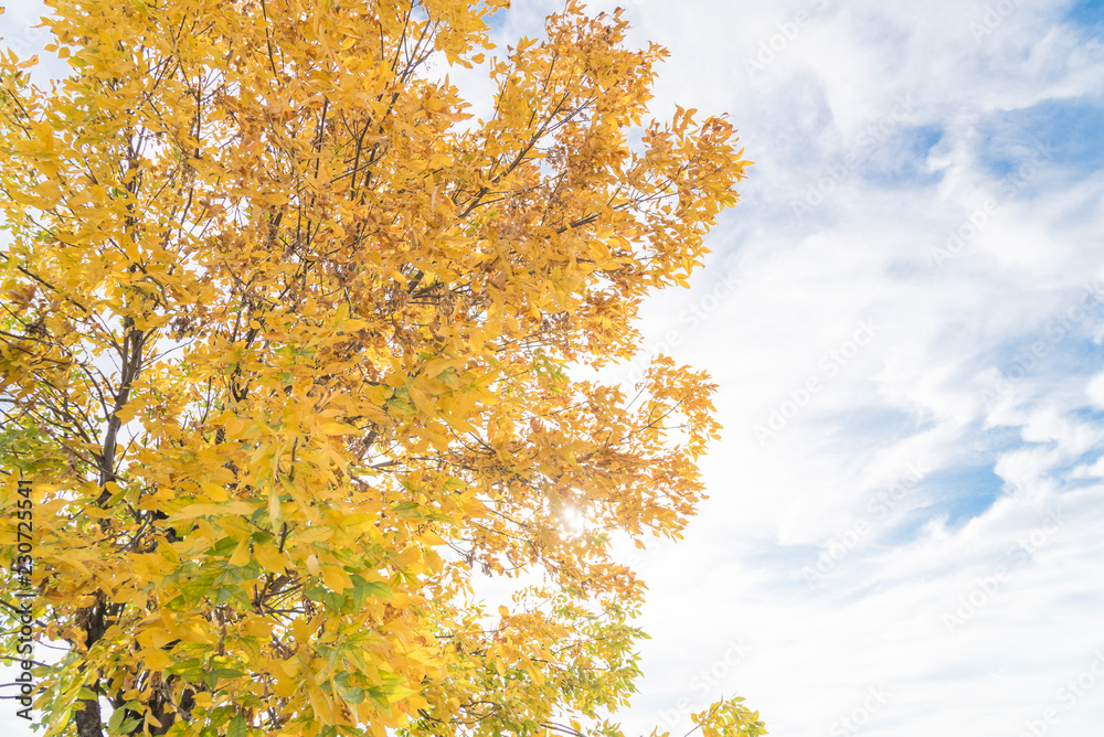 Changing season concept with beautiful Texas Cedar Elm trees leaves under autumn cloud blue sky. Stunning yellow fall foliage color background