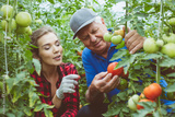 Senior farmer and young woman working together in greenhouse