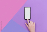 Kyiv, Ukraine, 2018-10-19. Top view of a woman hand using iphone XS on lilac background.