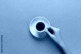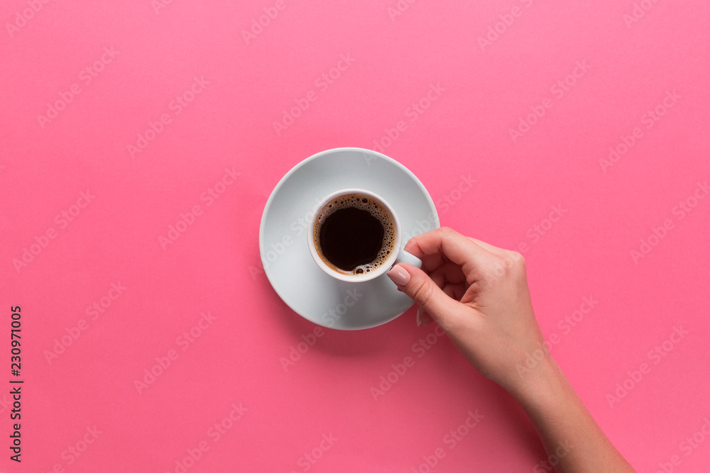 Minimalistic style woman hand holding a cup of coffee on pink background. Flat lay, top view