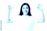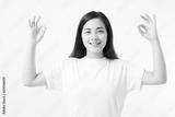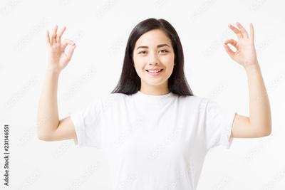 Zen sign. Calm asian girl in blank white t shirt isolated on template background. Copy space.
