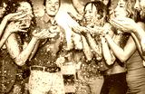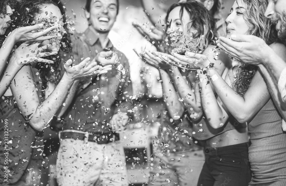 Happy friends having fun throwing confetti at vintage cocktail bar party