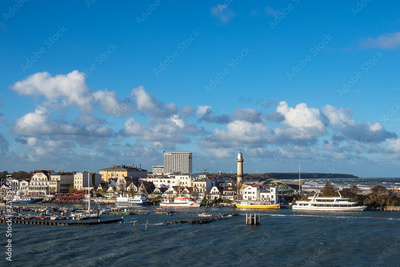 Blick auf den Leuchtturm und Teepott in Warnemünde