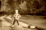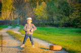 Happy little boy playing on road at sunset. He standing in the field and holding in hands suitcase and balloons.