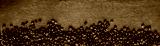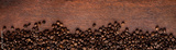 fresh roasted coffee beans on natural dark oak wood panorama background