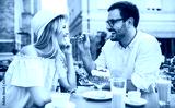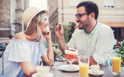Dating in the cafe. Loving couple drinking coffee and eating fruit desserts. Dating, love, relationships