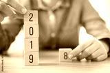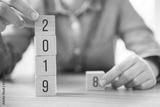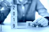 Hands of woman change wood cube text 2018 to new year 2019.