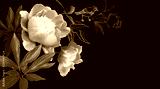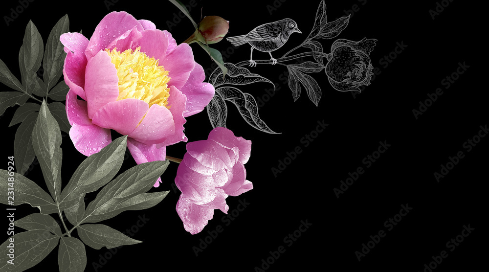 Floral modern card. Photo pink flowers peonies and drawing bird on a branch on black background. Template for design wedding invitations, greetings, business card, decoration packaging, banner poster