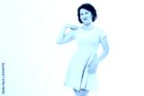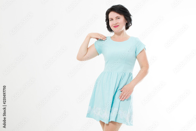 Happy middle age woman in fashion template blank dress with make up isolated on white background. Copy space