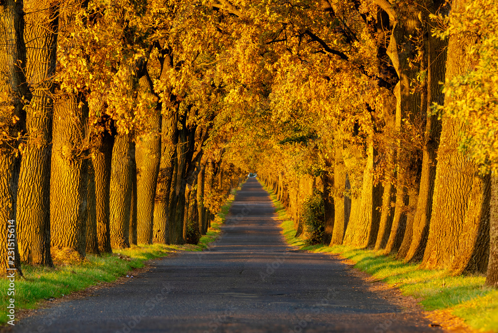 Autumn landscape road with colorful trees . Great oak alley.Autumn foliage with country road