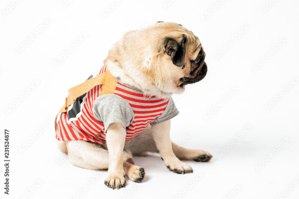 Cute dog pug breed wearing shirt making funny and serious face feeling confused and happiness isolated on white background,Animal Friendly Concept