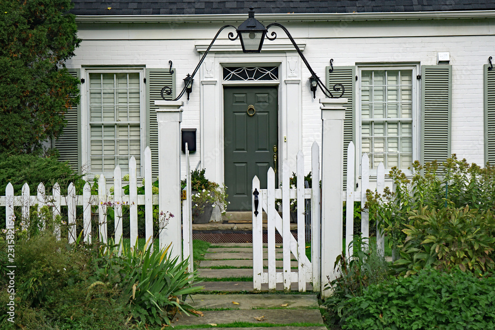front door of small white brick house with picket fence