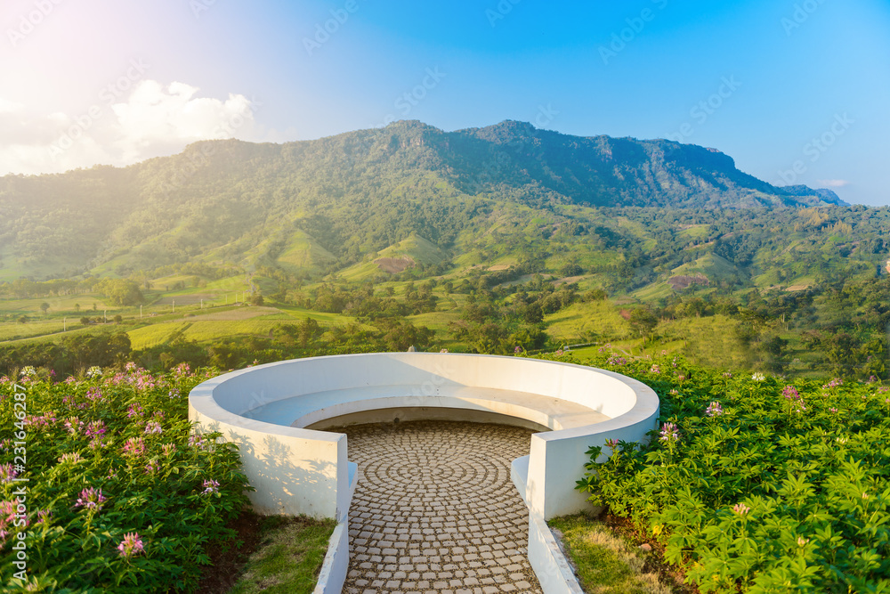 Khao Kho Viewpoint and great mountain view as background with circle platfrom for standing photo in sunset time