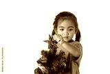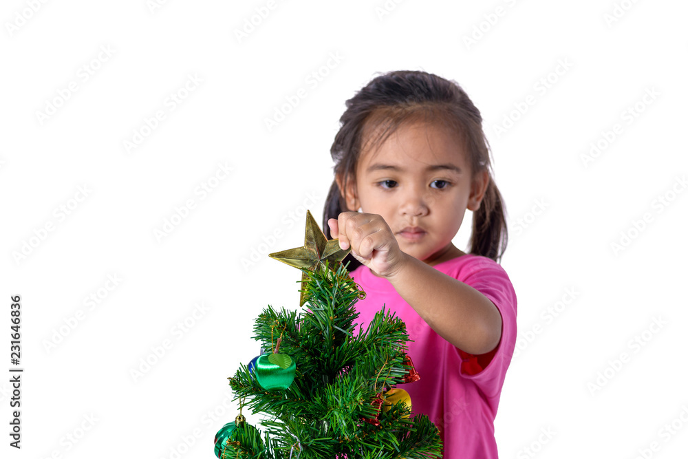 Happy asian child holding gold star for decoration Christmas tree. Christmas or happy newyear time