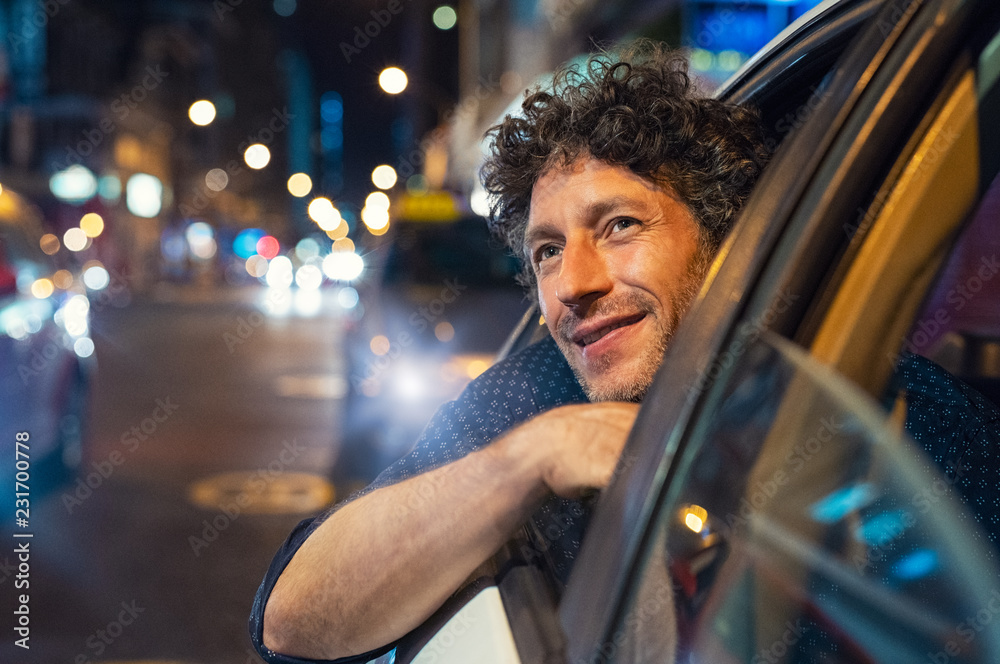 Happy man looking the city at night