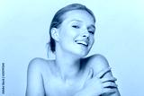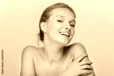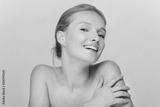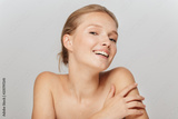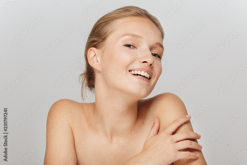 Portrait of young pretty smiling woman without makeup happily looking in camera over gray background isolated