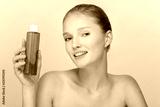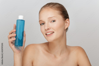 Portrait of beautiful smiling woman without makeup holding blue cosmetic bottle in hand while dreamily looking in camera over gray background