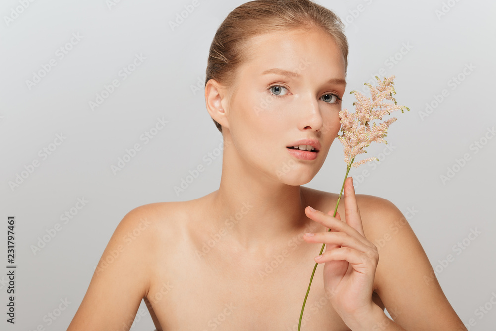 Portrait of young pensive lady without makeup holding beautiful branch near face thoughtfully looking in camera over gray background isolated