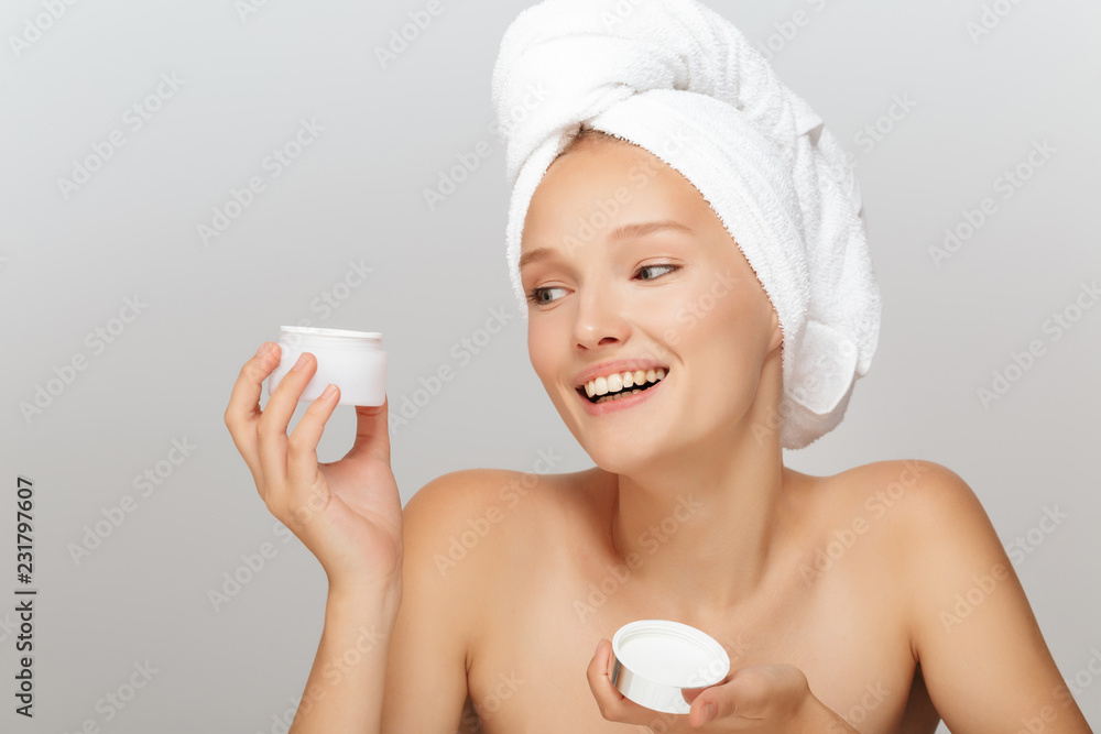 Portrait of cheerful girl without makeup with white towel on head holding face cream in hand while happily looking aside over gray background