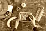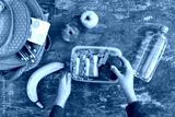 Sandwiches, fruits and vegetables in food box, backpack on old wooden background. Concept of child eating at school. Top view. Flat lay.