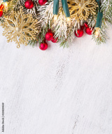 Fir branch with Christmas decorations and glowing garland on old wooden shabby background with empty space for text. Top view.