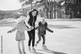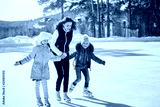 A group of three girls on a winter skating rink. Roll and laugh. Skating rink in nature.