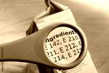 Concept of reading ingredients list on food package with magnifying glass. Magnifying glass on food additives label.