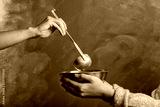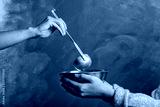Volunteer putting food into bowl of poor woman on color background, closeup. Concept of help
