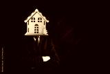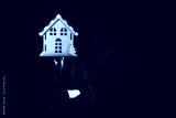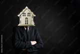 A businessman with woden house instead of his head stands with folded arms on black background
