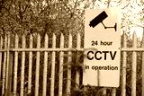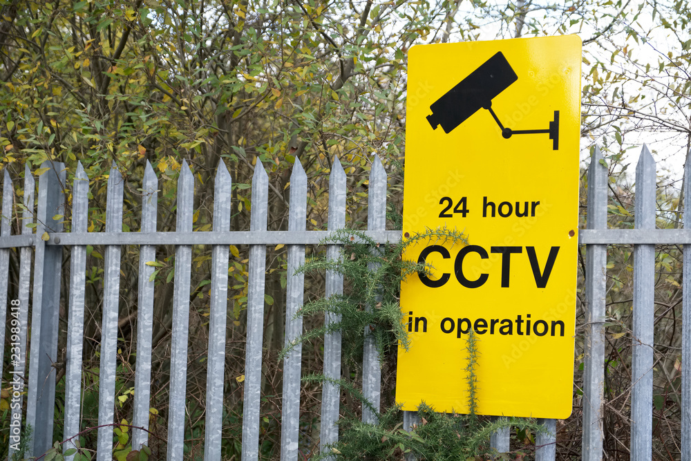 CCTV yellow sign on security railing