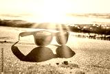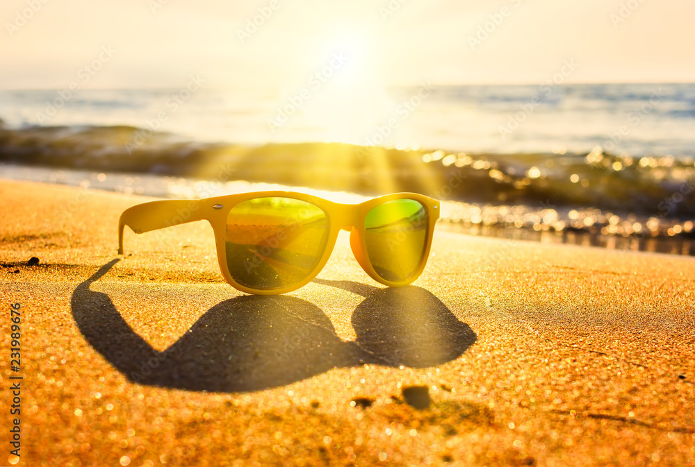 sun's rays cut through the stylish yellow sunglasses on the edge of the shore near the waves on sand.