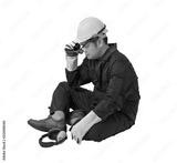 worker in Mechanic Jumpsuit is Sitting isolated on white background