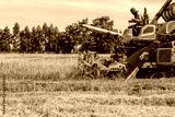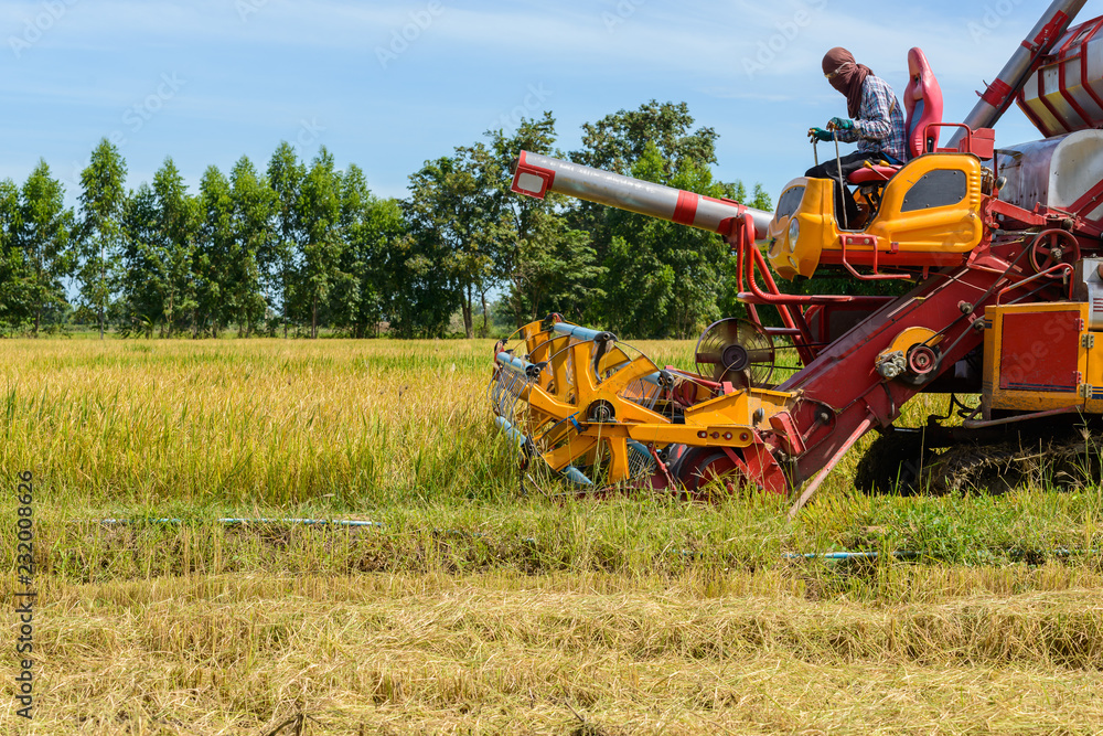 Combine harvester Working on rice field. Harvesting is the process of gathering a ripe crop