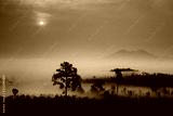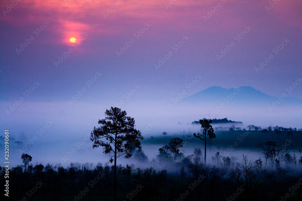 silhouette tree with thick fog. morning in rain forest. Sky turning colorful orange during sunrise in the morning.
