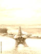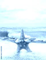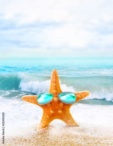 Beach. Summer. Starfish in sunglasses on the seashore.
