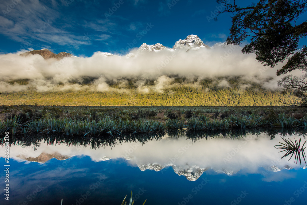 Mirror Lakes with reflection of Earl Mountains, Fjordland National Park, Millford, New Zealand