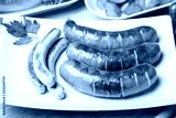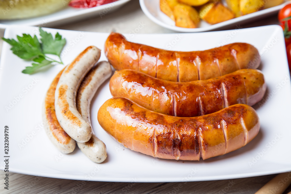 Grilled sausages with potatoes, cucumbers and sauerkraut, with two sauces. Close-up, selective focus.