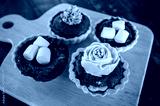Close-up of Assorted mini brownie tart serving on the wooden table.