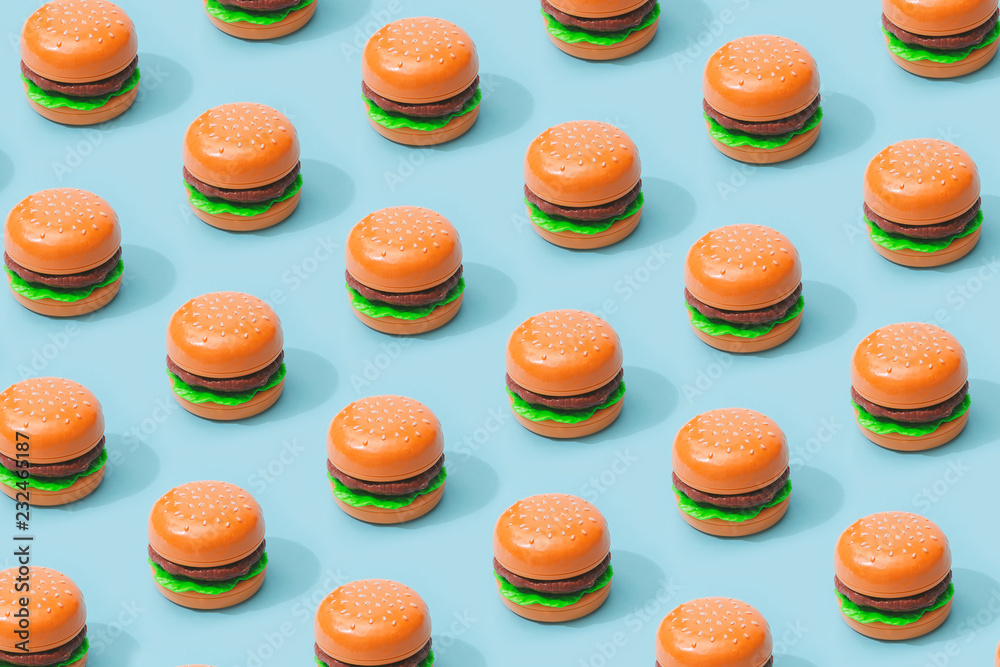 Hamburger fast food pattern on pastel blue background. Minimal junk food concept.